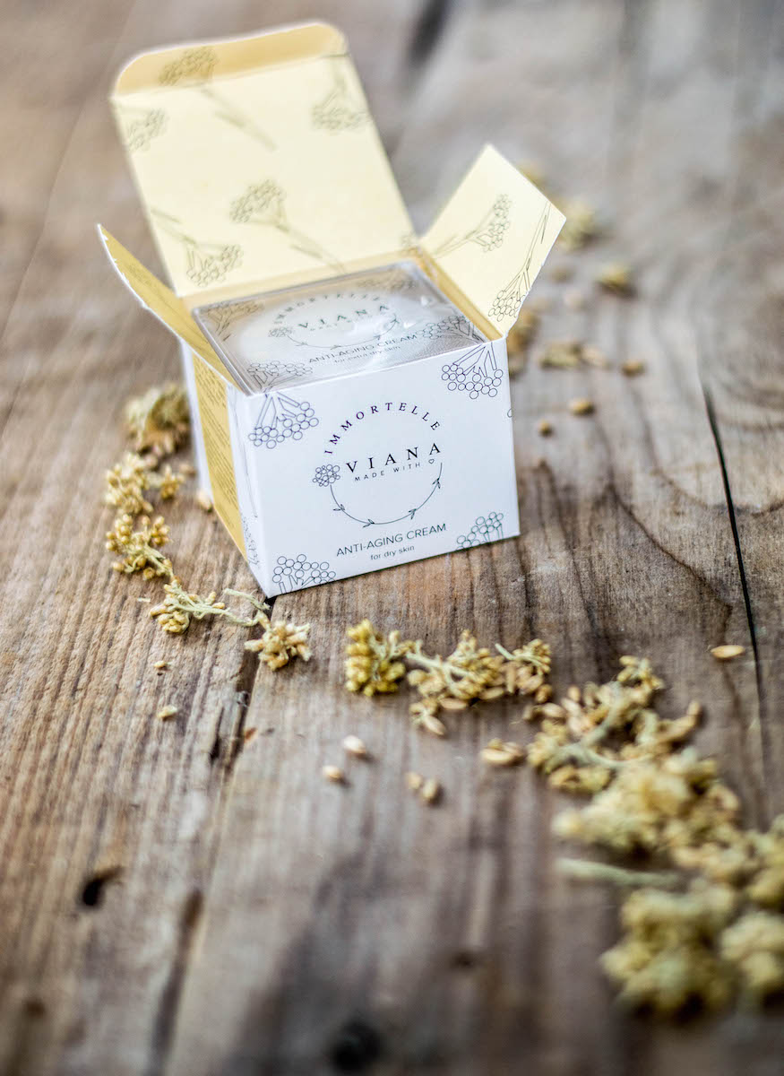 Made from high-quality essential oils, VIANA cosmetic line is completely natural, handmade and Infused with the healing power of immortelle (Helichrysum italicum), known for its strong anti-aging, regenerative and anti-inflammatory properties. VIANA Immortelle products nourish the skin in the most natural way.